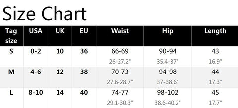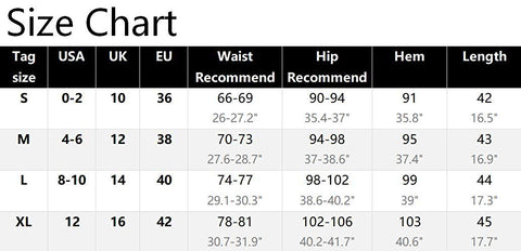 L=US 8-10 / UK 14 / EU 40 : ---Waist Recommend :29.1-30.3" ---Hip Recommend :38.6-40.2"---Hem :39" ---Length :17.3"